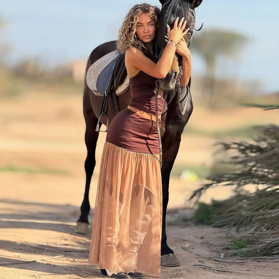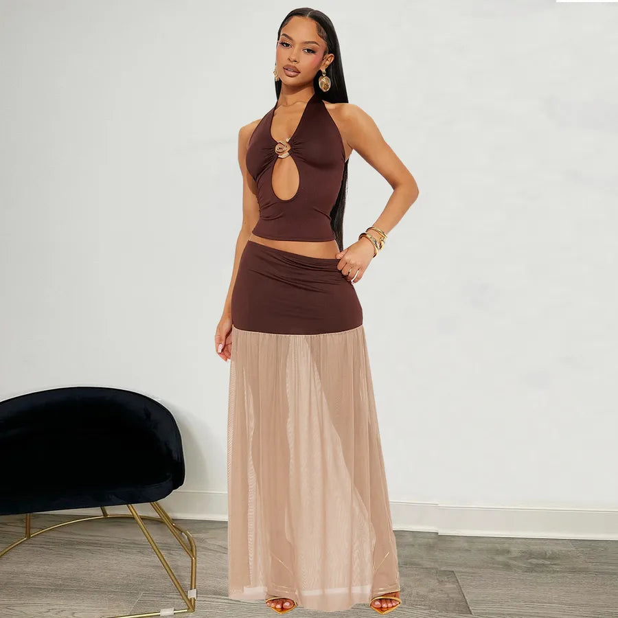 Ensemble haut court dos nu et jupe à blocs de couleurs, nouvelle collection été, col suspendu, style européen, tenue décontractée pour femmes
